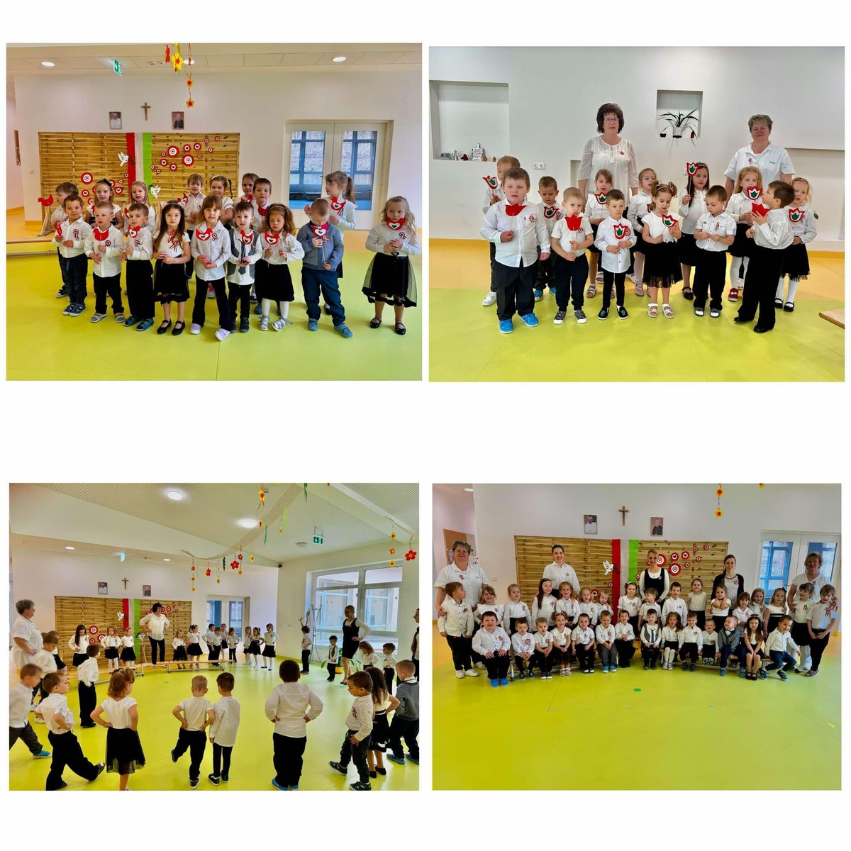 Az ünnepi műsort követően verbunkos táncházzal leptük meg a gyermekeket, majd a héten készített nemzeti színű alkotásainkat helyeztük el az óvoda bejáratához.